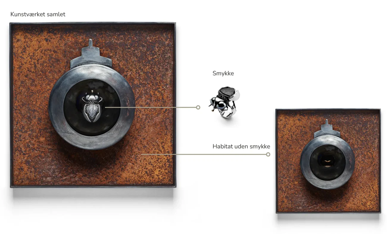 Derfor er Habitat-serien tænkt som en udstilling, på sigt flere og større udstillinger, og insektsmykkerne sælges kun sammen med dets habitat og begge med en udstillingsklausul. Jeg går meget gerne i dialog med udstillingssteder og andre med interesse for værkserien og dens temaer, der spænder mellem guldsmedehåndværk, natur og fantasi.