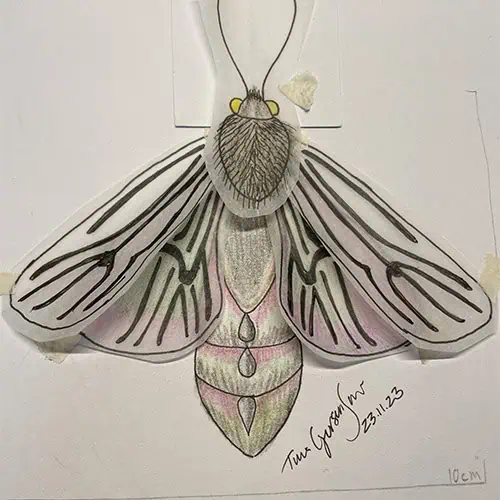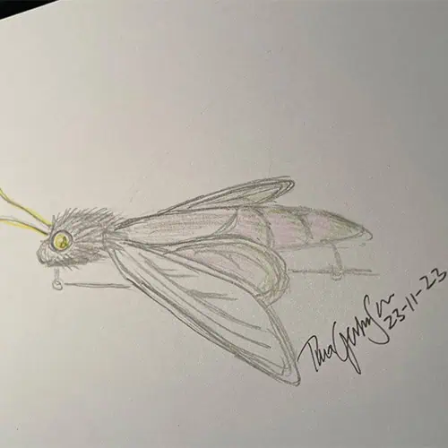 Jeg blev inspireret af din glæde ved farver, dit mod og din kreativitet i livet. Din personlighed fik mig til at tænke på det nataktive insekt, kanelbjørn (Phragmatobia fuliginosa).