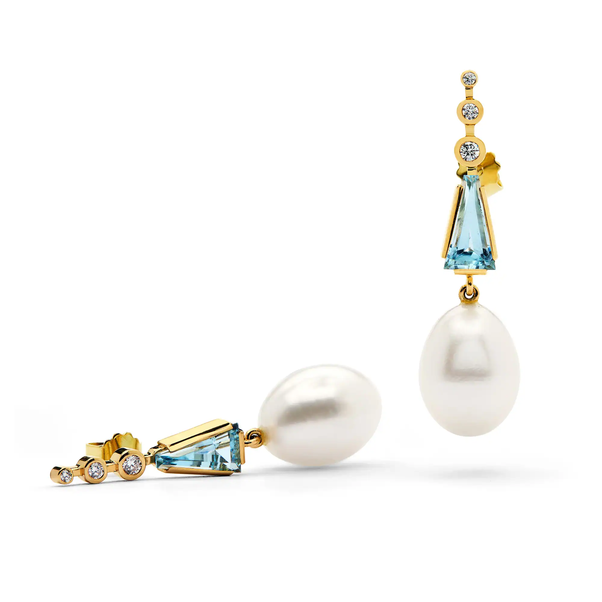 14 karat guldøreringe med i alt 0,19 ct brillanter, 1,96 ct vivid blue akvamariner og udskiftelige perlevedhæng.