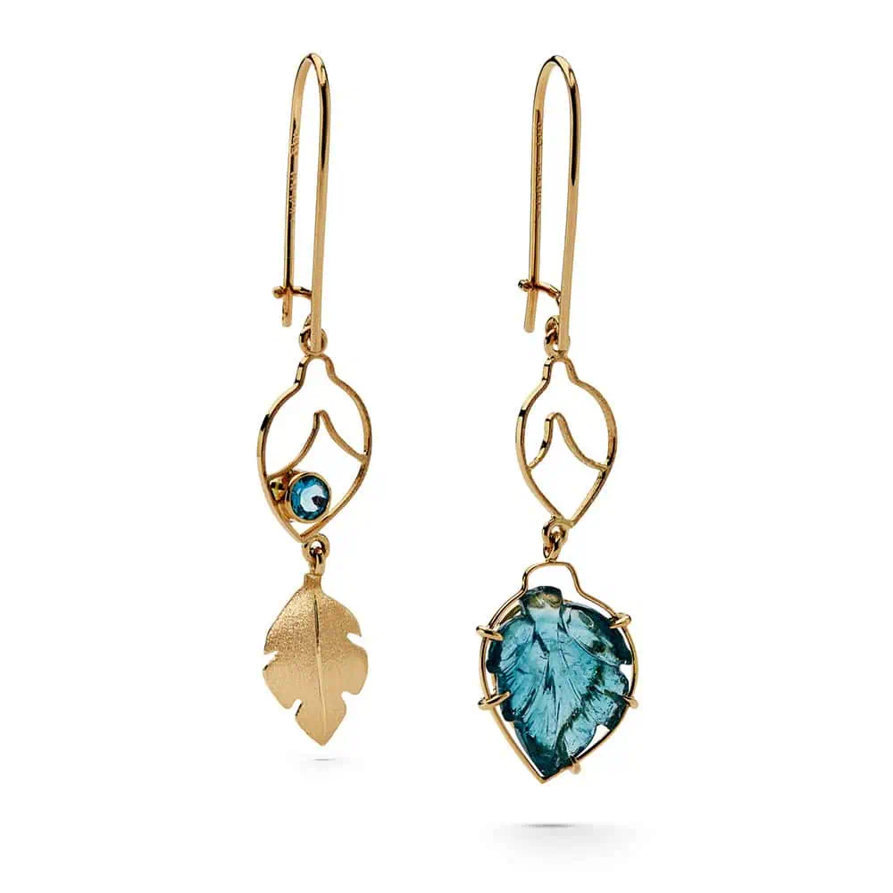 Lange øreringe af 14 karat guld, matteret og blankt, tilsat et smukt slebet blå/grønt turmalin blad og en lille facetteret turmalin.