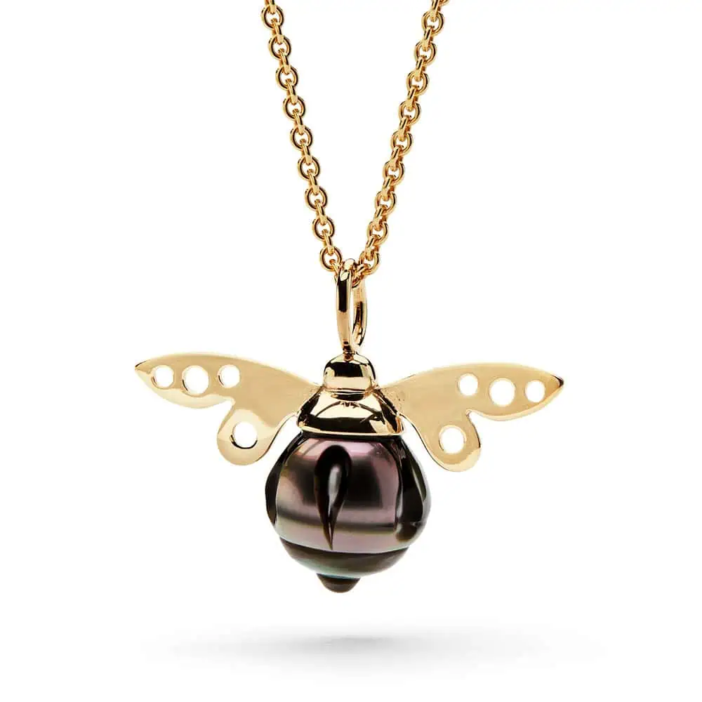 Den lille svirreflue spreder glæde alle vegne. 14 karat guld vinger med en krop af Tahitiperle. Blomsterfluen findes med forskellige farver Tahitiperler med og uden graveringer samt i sølv med ferskvandsperler i grå, hvide og rosa nuancer.