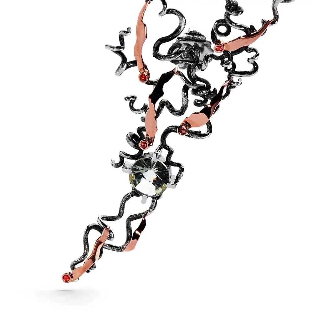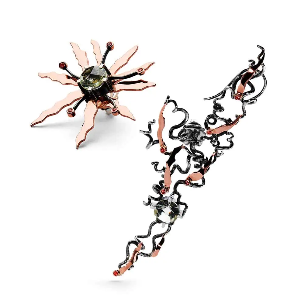 Højre øre: en særlig blomst af rosa guld med grene af oxyderet sølv isat facetslebet orange safirer og en specialslebet Prasiolit som centersten.