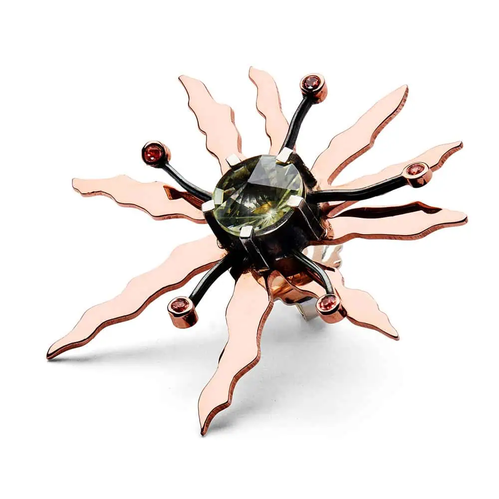 Venstre øre: Smykket sidder højt på øret, med en ørestikker til almindeligt ørehul samt en bøjle op langs toppen af øret til at stabilisere smykket. Vildt skovkrat med flammer af rosaguld og orangesafirer. Denspecialslebne lysegrønne Prasiolit minder om at snart grønnes skoven igen.