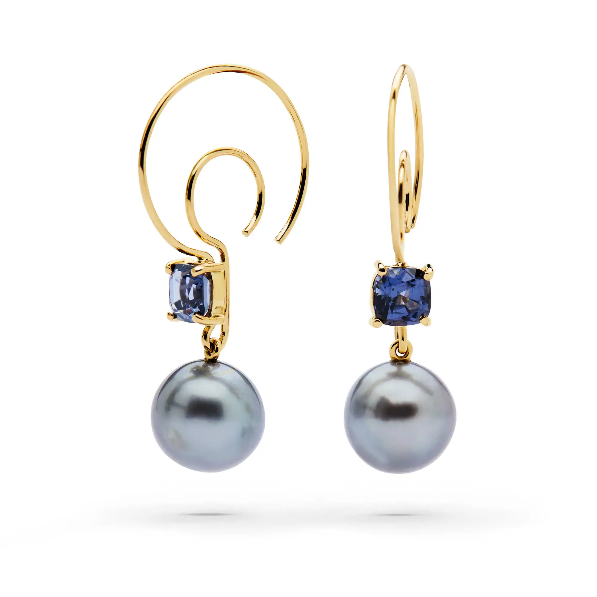 14 karat guldøreringe med 2 lavendelfarvede spineller, i alt 1,97 carat, samt to Tahiti-kulturperler (rund/barok – short), str. 10,85 mm, grade A, fra Marcharit.