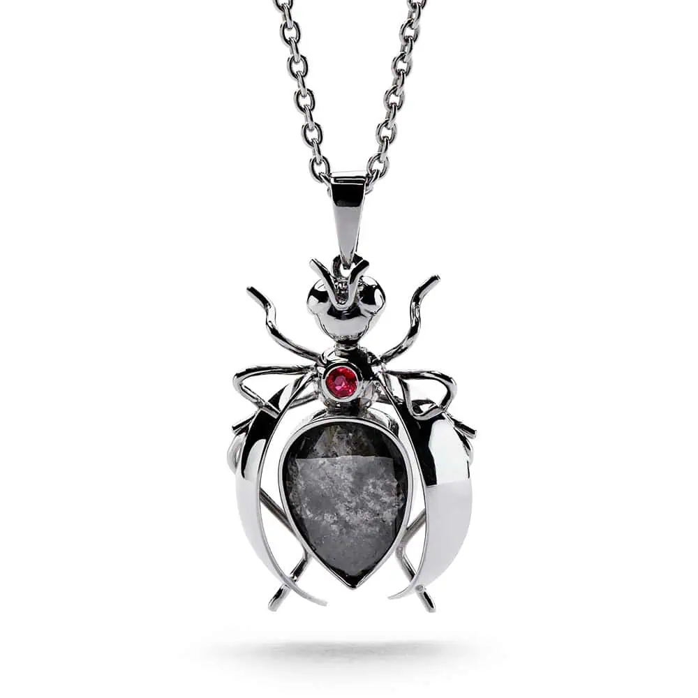 Halssmykke af 14 karat hvidguld med rosenslebent 1,72 carat salt og peber diamant dråbe og lille facetteret rubin 0.04 carat. De små vinger er trukket til side så den er flyveklar og dermed viser sin smukke diamantkrop.